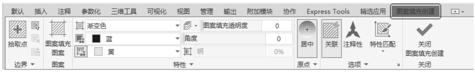 执行上述命令后系统打开图3-98所示的“图案填充创建”选项卡,各面板中的按钮含义与图案填充的类似,这里不再赘述。