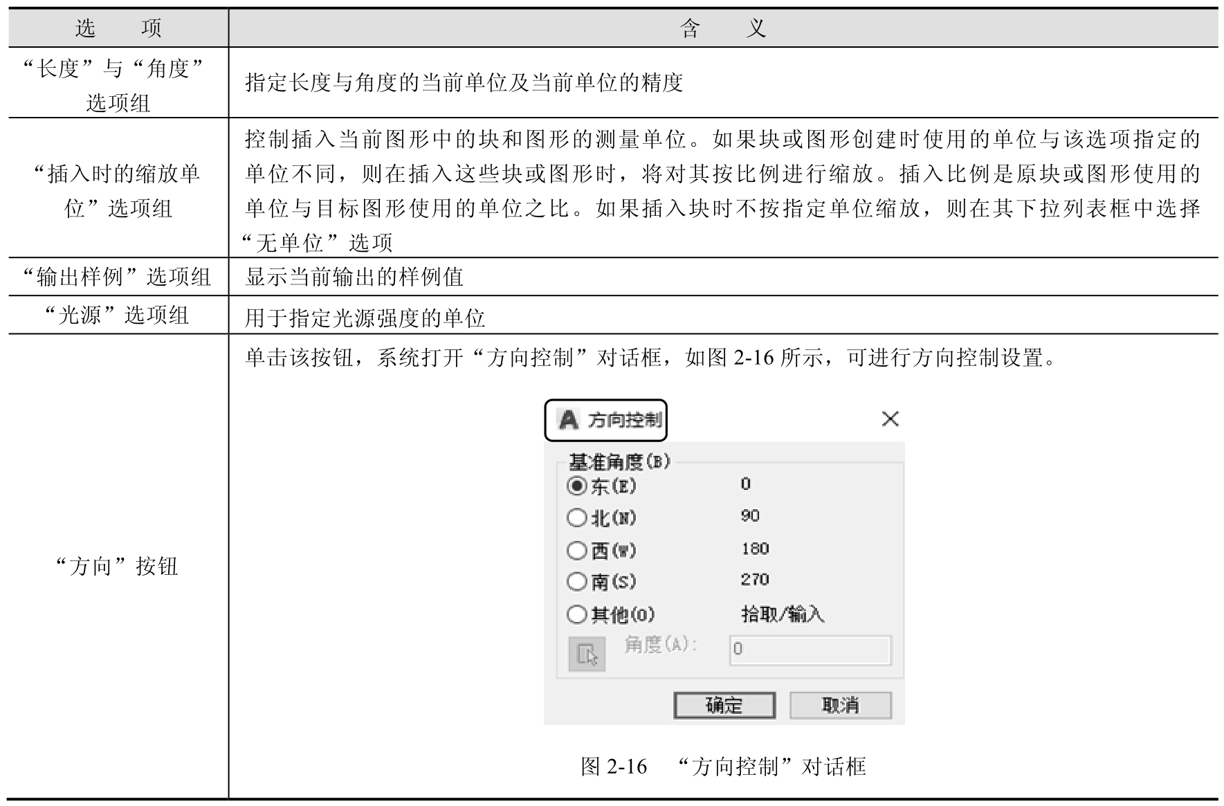 执行上述命令后,系统打开“图形单位”对话框,如图2-15所示,该对话框用于定义单位和角度格式。