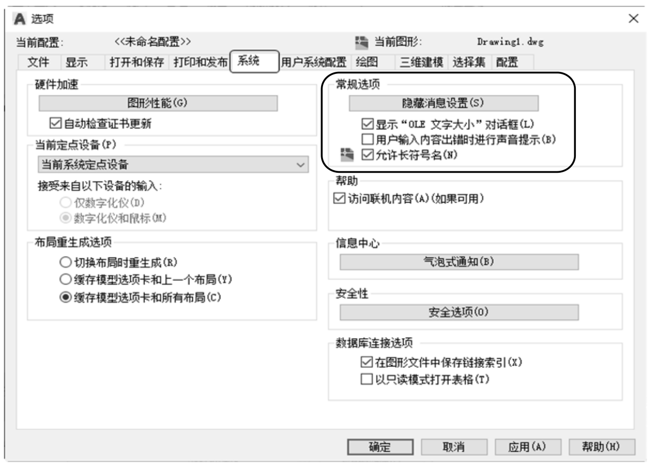 (1)系统配置。“选项”对话框中的第5个选项卡为“系统”选项卡,如图2-19所示。该选项卡用来设置AutoCAD系统的有关特性。其中“常规选项”选项组确定是否选择系统配置的有关基本选项。