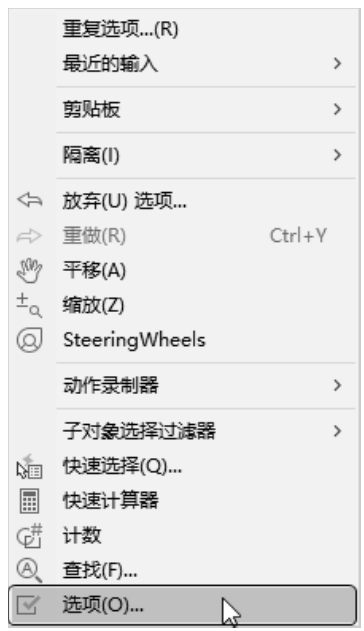 快捷菜单:在绘图区右击,系统打开快捷菜单,如图2-18所示,选择“选项”命令。