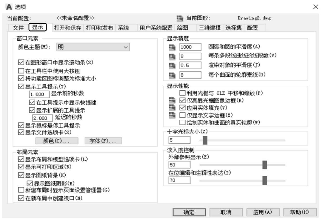 (2)显示配置。“选项”对话框中的第2个选项卡为“显示”选项卡,该选项卡用于控制AutoCAD系统的外观,如图2-20所示。该选项卡设定窗口元素、布局元素、显示精度、显示性能、十字光标大小、淡入度控制等。