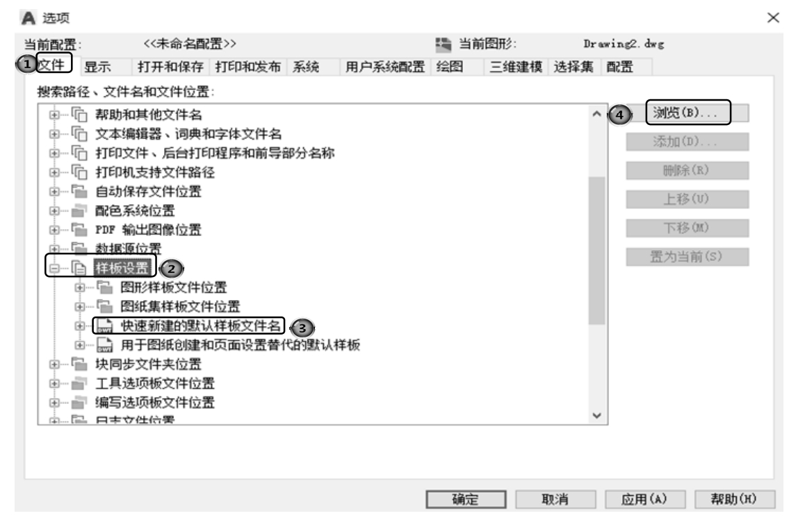 (2)选择菜单栏中的“工具”→“选项”命令,在“选项”对话框中选择默认图形样板文件。具体方法是: