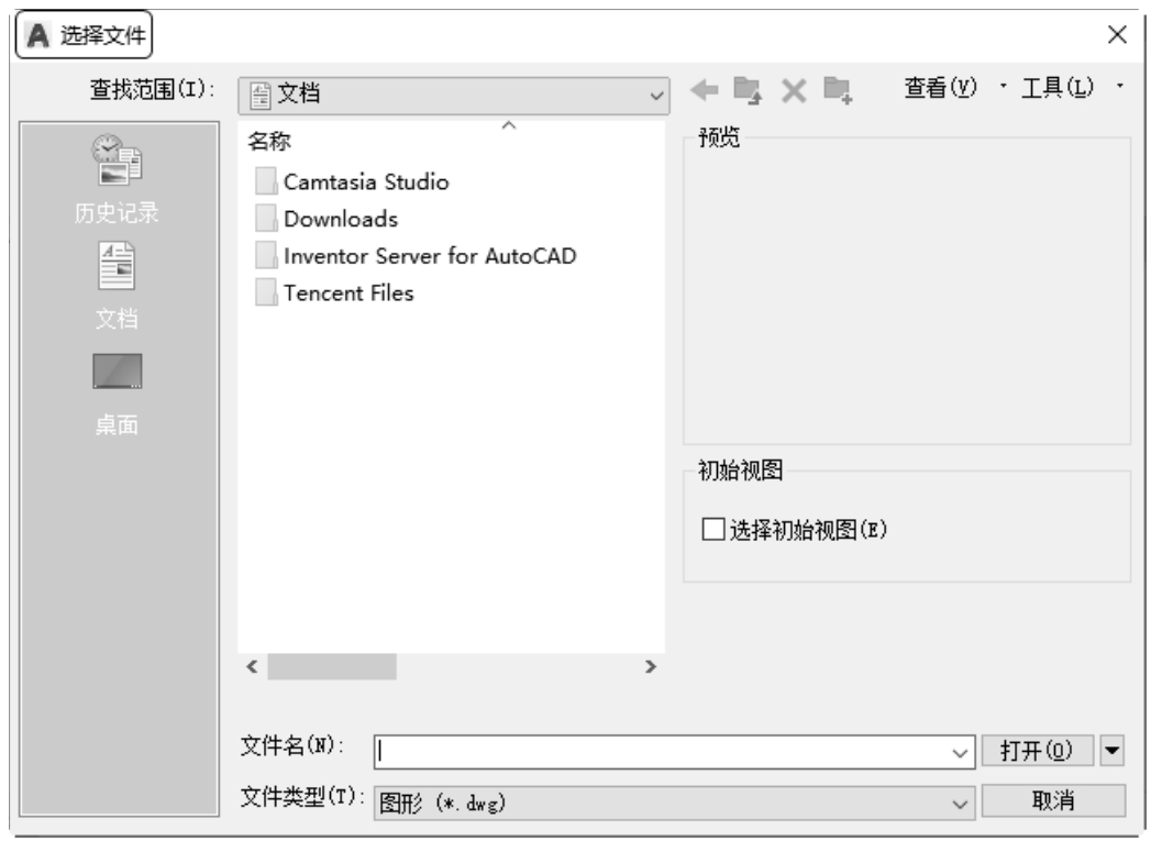 执行上述命令后,打开“选择文件”对话框,如图2-23所示,在“文件类型”下拉列表框中用户可选.dwg文件、.dwt文件、.dxf文件和.dws文件。.dws文件是包含标准图层、标注样式、线型和文字样式的样板文件;.dxf文件是用文本形式存储的图形文件,能够被其他程序读取,许多第三方应用软件都支持.dxf格式。