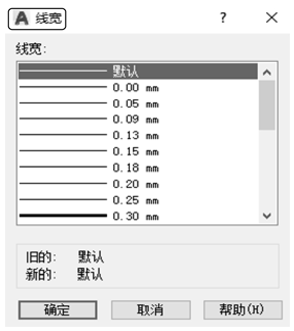 单击图层所对应的线宽图标,弹出“线宽”对话框,如图2-33所示。选择一个线宽,单击“确定”按钮完成对图层线宽的设置。