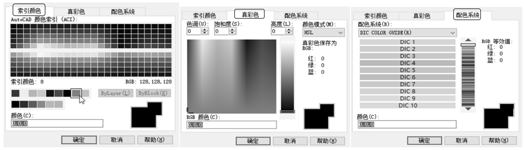 要改变图层的颜色时,单击图层所对应的颜色图标,弹出“选择颜色”对话框,如图2-30所示。它是一个标准的颜色设置对话框,可以使用索引颜色、真彩色和配色系统3个选项卡来选择颜色。系统显示RGB配比,即Red(红)、Green(绿)和Blue(蓝)3种颜色。