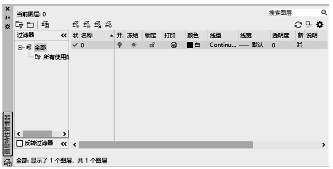 新建的CAD文档中只能自动创建一个名为0的特殊图层。默认情况下,图层0将被指定使用7号颜色、CONTINUOUS线型、默认线宽以及NORMAL打印样式。不能删除或重命名图层0。通过创建新的图层,可以将类型相似的对象指定给同一个图层使其相关联。例如,可以将构造线、文字、标注和标题栏置于不同的图层上,并为这些图层指定通用特性。通过将对象分类放到各自的图层中,可以快速有效地控制对象的显示以及对其进行更改。