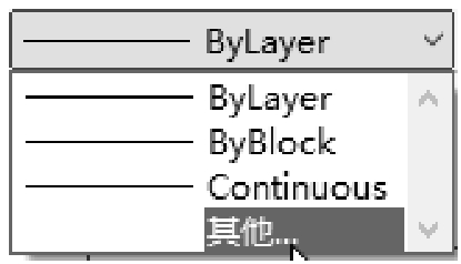 也可以在“特性”工具栏上的“颜色”“线型”“线宽”和“打印样式”下拉列表中选择需要的参数值。如果在“颜色”下拉列表中选择“选择颜色”选项,如图2-38所示,系统就会打开“选择颜色”对话框,如图2-30所示;同样,如果在“线型”下拉列表中选择“其他”选项,如图2-39所示,系统就会打开“线型管理器”对话框,如图2-35所示。
