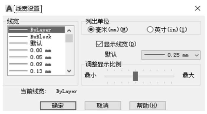 执行上述命令后,系统弹出“线宽设置”对话框,如图2-36所示。该对话框的使用方法与图2-33所示的“线宽”对话框类似。