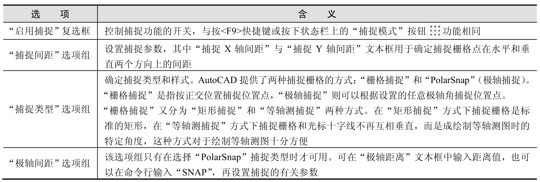表2-3 “捕捉与栅格”选项卡选项含义