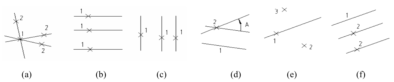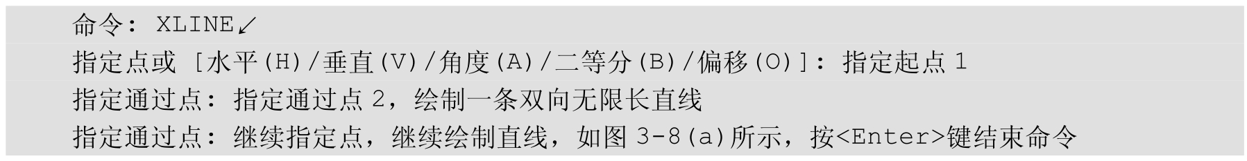 (1)利用选项中有“指定点”“水平”“垂直”“角度”“二等分”和“偏移”6种方式绘制构造线,分别如图3-8(a)~(f)所示。