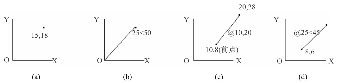 在相对坐标输入方式下,表示为“@长度<角度”,如“@25<45”,其中长度为该点到前一点的距离,角度为该点至前一点的连线与X轴正向的夹角,如图3-1(d)所示。