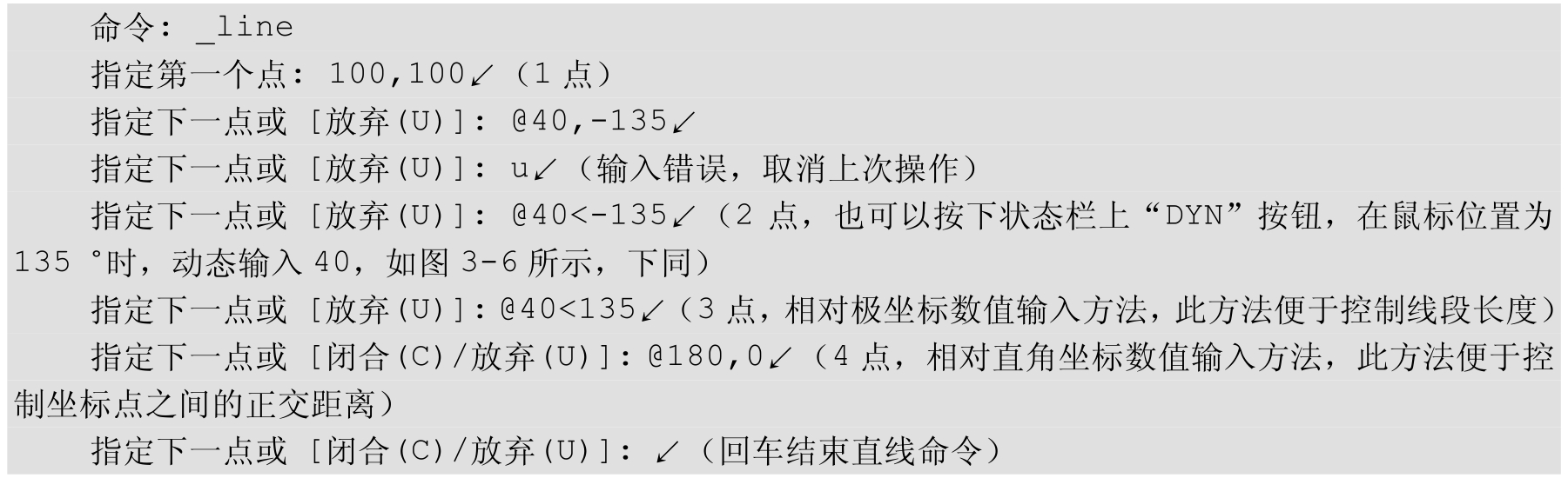 (a)用键盘直接在命令行输入点的坐标。直角坐标有两种输入方式:x,y(点的绝对坐标值,如“100,20”)和@x,y(相对于上一点的相对坐标值,如“@20,-30”)。
