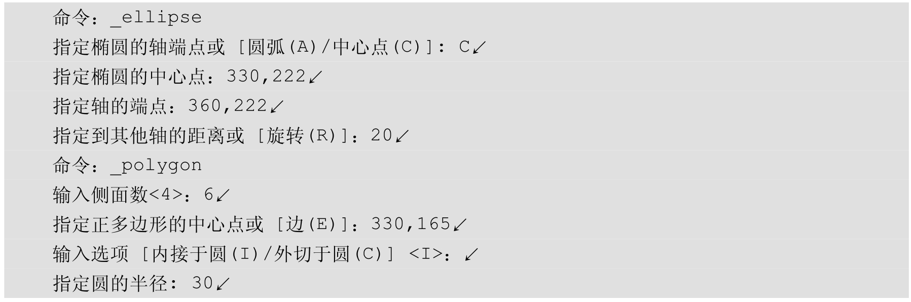 (4)单击“默认”选项卡“绘图”面板中的“椭圆”按钮 ,绘制中心点坐标为(330,222),长轴的右端点坐标为(360,222),短轴的长度为20的小椭圆;单击“默认”选项卡“绘图”面板中的“多边形”按钮 ,绘制中心点坐标为(330,165),内接圆半径为30的正六边形。