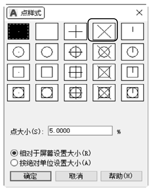 (2)设置点样式。选择菜单栏中的“格式”→“点样式”命令,在打开的“点样式”对话框中选择“X”样式,如图3-50所示。