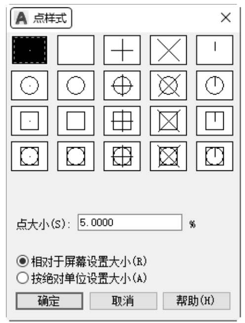 (3)点在图形中的表示样式,共有20种。可通过“DDPTYPE”命令或选择菜单栏中的“格式”→“点样式”命令,通过打开的“点样式”对话框来设置,如图3-46所示。