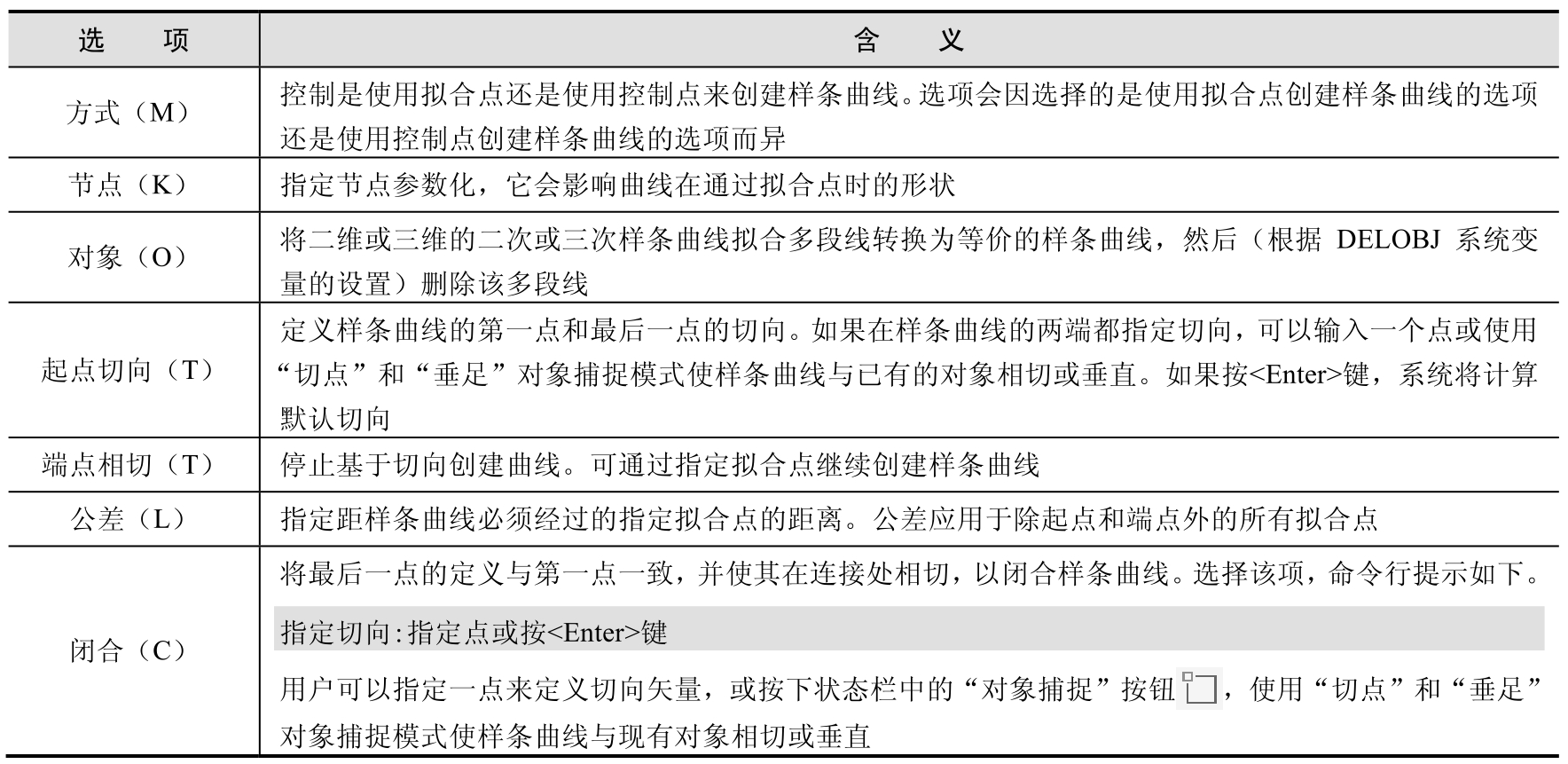 表3-6 “样条曲线”命令选项含义