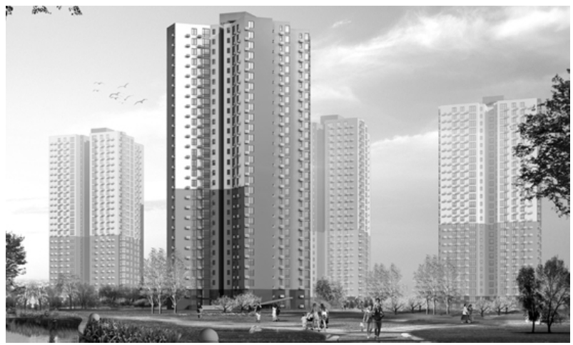 (5)建筑透视效果图:除上述类型图形外,在实际工程实践中还经常要绘制建筑透视图,尽管其不是施工图所要求的。但由于建筑透视图表示建筑物内部空间或外部形体与实际所能看到的建筑本身相类似的主体图像,它具有强烈的三度空间透视感,非常直观地表现了建筑的造型、空间布置、色彩和外部环境等多方面内容。可见,建筑透视图常在建筑设计和销售时作为辅助使用。从高处俯视的透视图又称作“鸟瞰图”或“俯视图”。建筑透视图一般要严格地按比例绘制,并进行绘制上的艺术加工,这种图通常被称为建筑表现图或建筑效果图。一幅绘制精美的建筑表现图就是一件艺术作品,具有很强的艺术感染力。如图1-10所示为某高层建筑三维外观透视效果图。