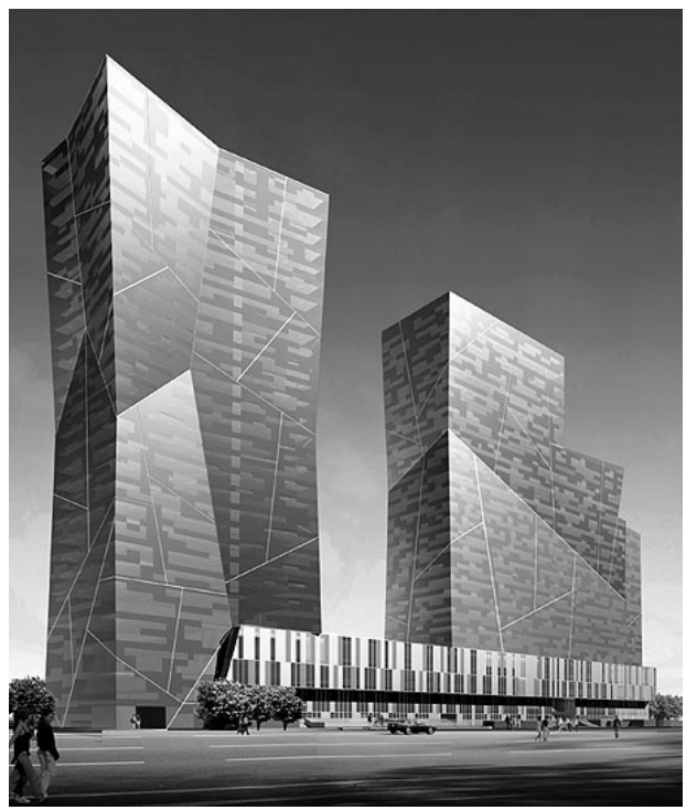 (5)建筑透视效果图:除上述类型图形外,在实际工程实践中还经常要绘制建筑透视图,尽管其不是施工图所要求的。但由于建筑透视图表示建筑物内部空间或外部形体与实际所能看到的建筑本身相类似的主体图像,它具有强烈的三度空间透视感,非常直观地表现了建筑的造型、空间布置、色彩和外部环境等多方面内容。可见,建筑透视图常在建筑设计和销售时作为辅助使用。从高处俯视的透视图又称作“鸟瞰图”或“俯视图”。建筑透视图一般要严格地按比例绘制,并进行绘制上的艺术加工,这种图通常被称为建筑表现图或建筑效果图。一幅绘制精美的建筑表现图就是一件艺术作品,具有很强的艺术感染力。如图1-10所示为某高层建筑三维外观透视效果图。