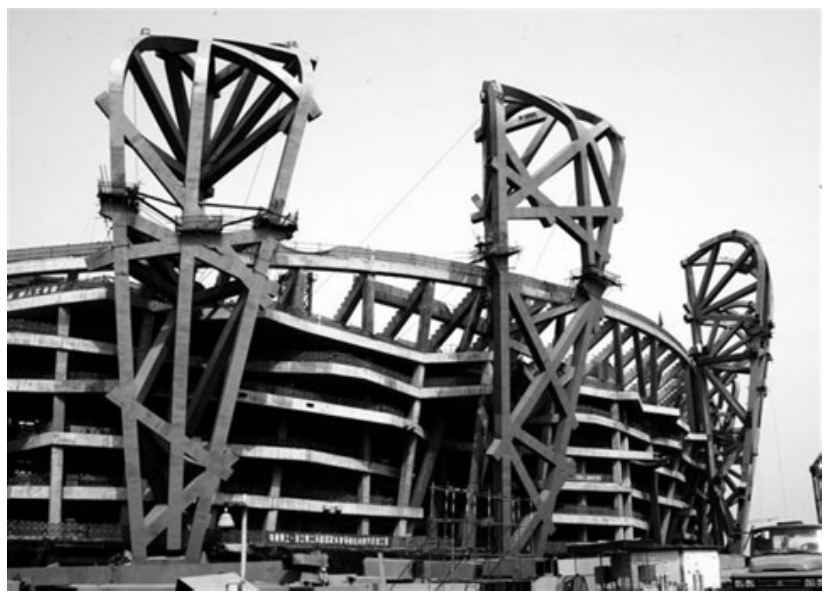 实施阶段也就是工程的施工阶段。建筑工程在施工前,设计人员应向施工单位进行设计意图说明及图纸的技术交底;工程施工期间需按图纸要求核对施工实况,有时还需根据现场实况提出对图纸的局部修改或补充;施工结束时,会同质检部门和建设单位进行工程验收。如图1-5所示是正在施工中的建筑(局部)。