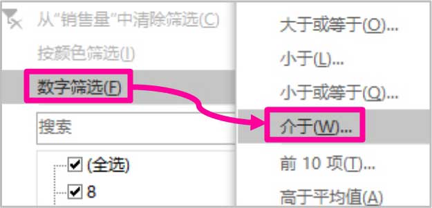 Step2: 单击“销售量”右下角的下拉三角标记→“数字筛选”→“介于”,如图1-43所示。
