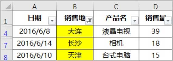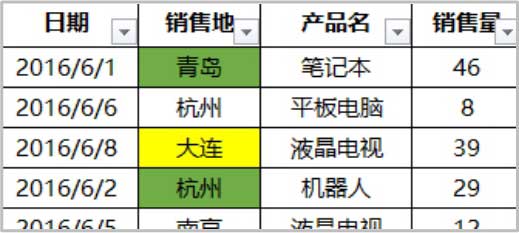 操作步骤为:单击“销售地”旁边的下拉三角标记,选择“按颜色筛选”,在二级筛选项中单击黄色填充框。可以看出,Excel能够预先识别单元格中的颜色,会给出颜色备选项,筛选的结果如图1-47所示。