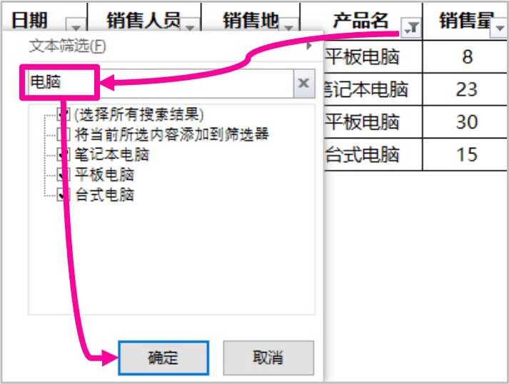 这些不同类型的筛选案例中有哪些共同的套路呢?首先,不管是数值筛选、文本筛选还是按颜色筛选,都需要指定筛选的依据(对销售量、产品名还是销售地进行筛选);然后,需要指定筛选的条件(筛选出某个区间或某种颜色)。因此,可以总结出筛选功能的三要素。