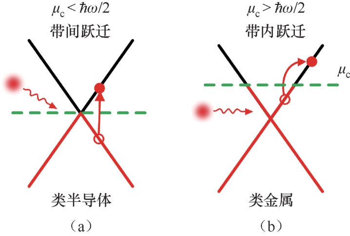 图2.13 石墨烯电子带内与带间跃迁的能带示意图 [2]