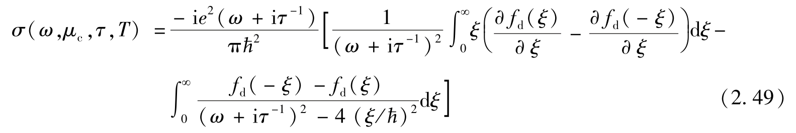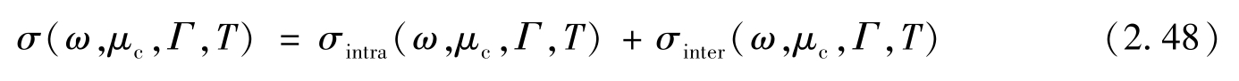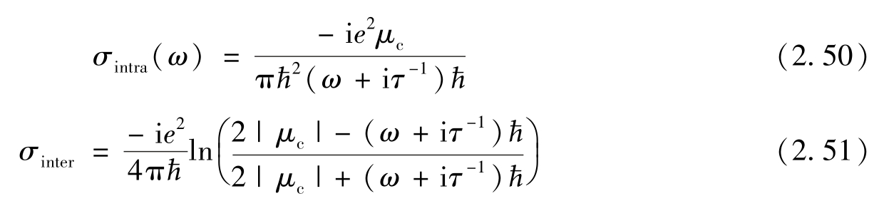当石墨烯的工作温度为室温300K时, K B T ≈0.026eV,远远小于工作电压偏置下的石墨烯化学势 μ c ,即 K B T <<| μ c |。则石墨烯电导率的带内跃迁 σ intra 和带间跃迁 σ inter 可以分别简化为 [103,104]