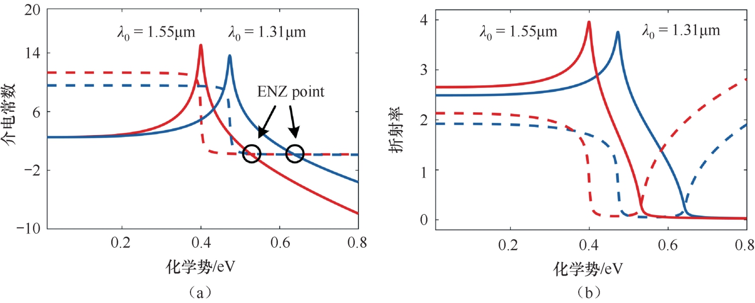 在特定工作频率下,进一步观察石墨烯的介电常数及折射率随掺杂浓度(石墨烯化学势)的变化曲线。以典型的光通信波长 λ 0 =1.31μm, λ 0 =1.55μm为例,当工作环境确定后,石墨烯的介电常数的虚部及实部在开始时全为正数,石墨烯表现为一种有损耗的介质层,当掺杂浓度继续加大到接近 μ c =1 / 2 ħω 时,石墨烯介电常数实部依然大于零,而介电常数虚部则突变为零,此时的石墨烯泡利阻塞抑制吸收,呈现为透明的介质层,当掺杂浓度进一步提升时,石墨烯的介电常数慢慢小于零,对应的折射率实部也开始小于1,此时,石墨烯渐渐往金属转变。一个有趣的点便是,在经过0.52eV(1.55μm)和0.63eV(1.31μm)的点时,石墨烯的介电常数实部及虚部均接近零,此时产生了一个介电常数接近零的点(ENZ point),如图2.16(a)中两个小圆圈所示。当工作于两个通信频段时,石墨烯的介电常数及等效折射率表现出相同的变化趋势,仅特征频率点随频率升高发生了蓝移。