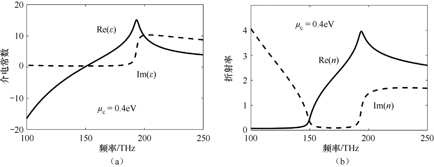 图2.15 不同工作频率下(从THz到可见光频段),石墨烯介电常数及等效折射率的变化趋势,对应石墨烯的化学势为0.4eV。(a)石墨烯的介电常数的实部与虚部随工作频率改变的变化曲线;(b)石墨烯的折射率的实部与虚部随工作频率改变的变化曲线
