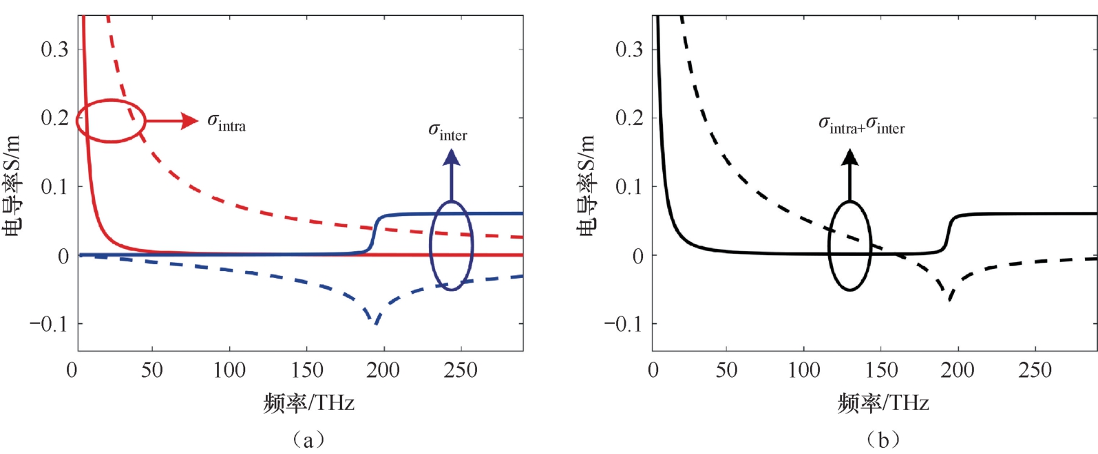 (1)带内跃迁带来的电导率实部及虚部均随频率降低而逐渐增强,且虚部大于实部,而带间跃迁则相反。表现的行为是低频时带内跃迁占主导,高频时带间跃迁更易发生,这也可从图2.14(b)的电导率曲线直观地看出。