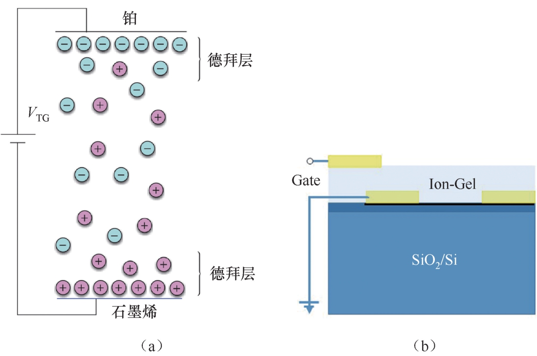 图2.17 (a)受到偏置电压影响,石墨烯和接地板(铂)两端汇聚正负离子,形成德拜层 [116] ;(b)基于固相电解质的石墨烯场效应管示意图 [117] ,源极、漏极接触石墨烯,而与栅极通过固相电解质隔离