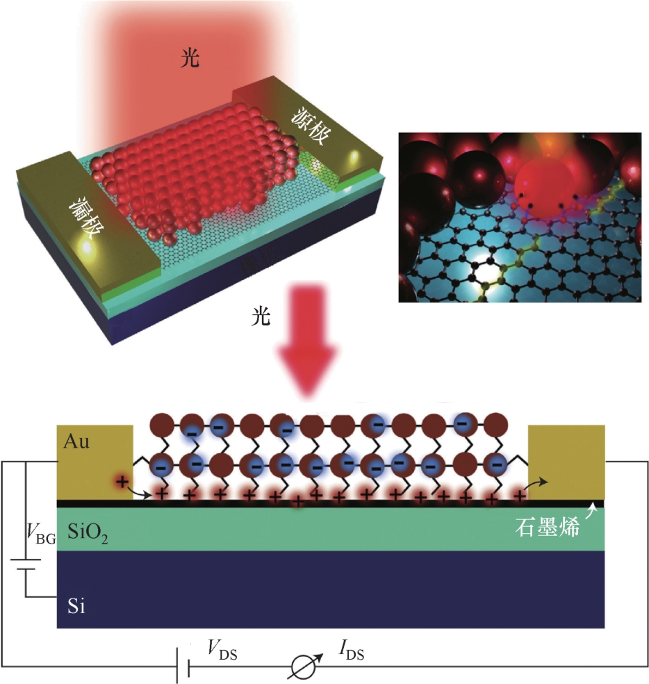 纳米厚度的光敏量子点能够吸收特定频段的电磁波,具有光生电子的功能。在石墨烯表面电子蒸镀特定的量子点,可以增强电磁波与石墨烯的相互作用,改善相关器件的性能指标 [125] 。例如,硫化铅(PbS)在红外光及可见光频段内具有很好的量子限域效应,西班牙光子科学研究所利用这种量子点极大地增强了对光子转化为载流子的效率,单个光子转换约10 8 个电子,示意图如图2.18所示;香港理工大学Feng Yan等人同样在石墨烯表面蒸镀硫化铅,增强了场效应管中源漏极电流,如果不加硫化铅量子点则无法观察到这种现象。另外,在紫外光波段的量子点材料二氧化钛(TiO 2 )结合石墨烯表现出的光电特性也有学者关注 [110] 。