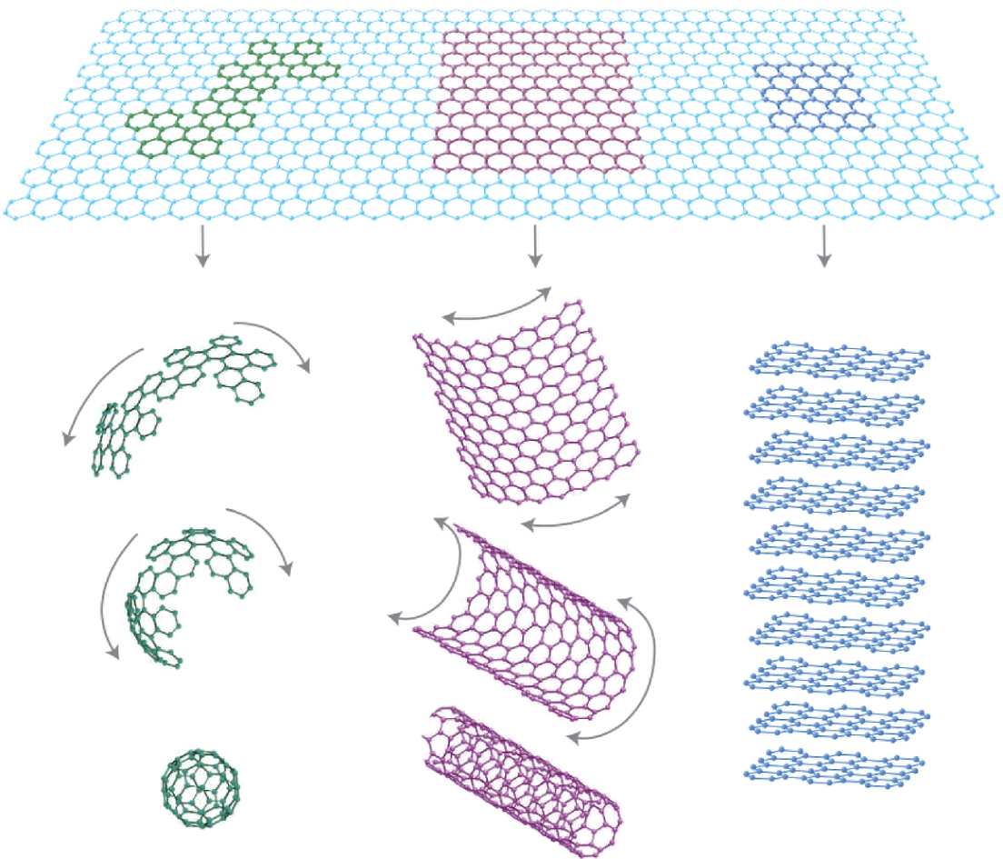 图1.1 石墨烯是其他所有维度碳材料的“建筑原料” [1]