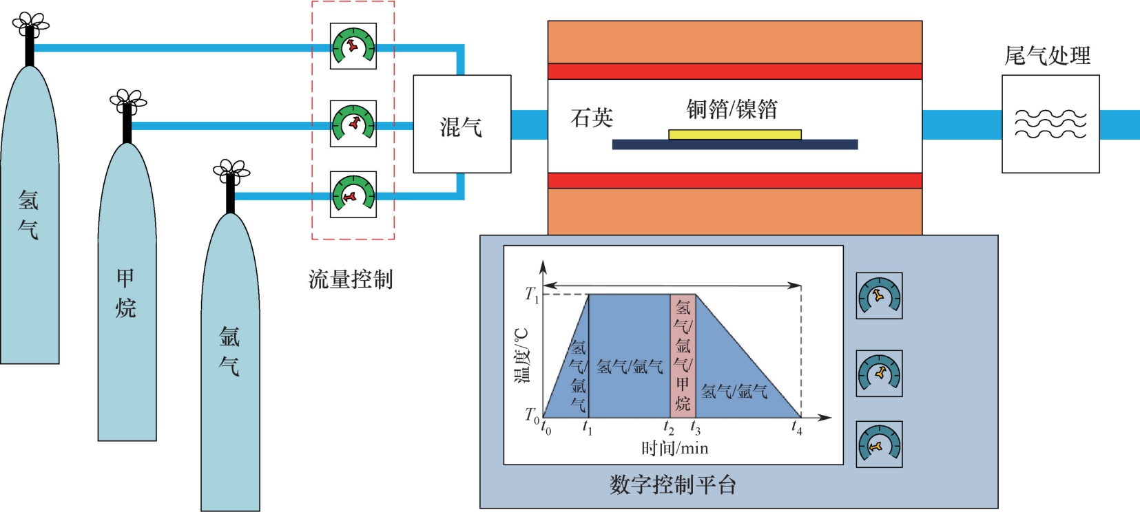 2008年,美国麻省理工学院Jing Kong等人将传统半导体化学气相沉积(Chemical Vapor Deposition,CVD)技术应用在了石墨烯制备上(见图1.8),得到了厘米级的单层、多层石墨烯,证明了用CVD法制备石墨烯是一种低成本、稳定可控的技术途径。由于不需要低压超高真空的要求,CVD技术极大地改善了石墨烯制备条件 [194] 。其使用的催化金属为多晶镍,制备过程大致为:首先在硅片(尺寸1~2cm 2 )上蒸镀500nm厚度的镍,再放置于CVD管式炉中,氩气和氢气(保护气体)以600sccm和500sccm的流速作为生长氛围,加热至900~1000℃且保持10~20min。镍具有较高的溶碳量,碳原子在高温环境下可以渗入金属基体内 [193] ,再在降温的过程中从内部析出成核,进而生长成为石墨烯薄片。2009年,韩国成均馆大学Byung Hee Hong使用了类似的制备工艺,他们在降温阶段使用了快速冷却技术(约10℃·s -1 ),能够减少多层现象,使得后续基底的转移更加容易 [195] 。转移后的石墨烯薄膜的表面方阻约为280Ω/□,透光率约为80%。总的来说,使用镍箔作为催化剂制备的石墨烯晶畴尺寸依然偏小,而且层数不容易控制,并且镍箔的刻蚀时间与石墨烯尺寸呈指数关系增长 [196] 。不过,国内外学者也在不断尝试改进完善镍箔作为基底生长石墨烯的工艺。例如,可以利用镍和铜对碳溶解能力的差异,将碳离子通过离子注入工艺注入到镍层中,经过退火得到石墨烯,并通过调节碳的注入量,实现对石墨烯层数的精确控制 [197] 。