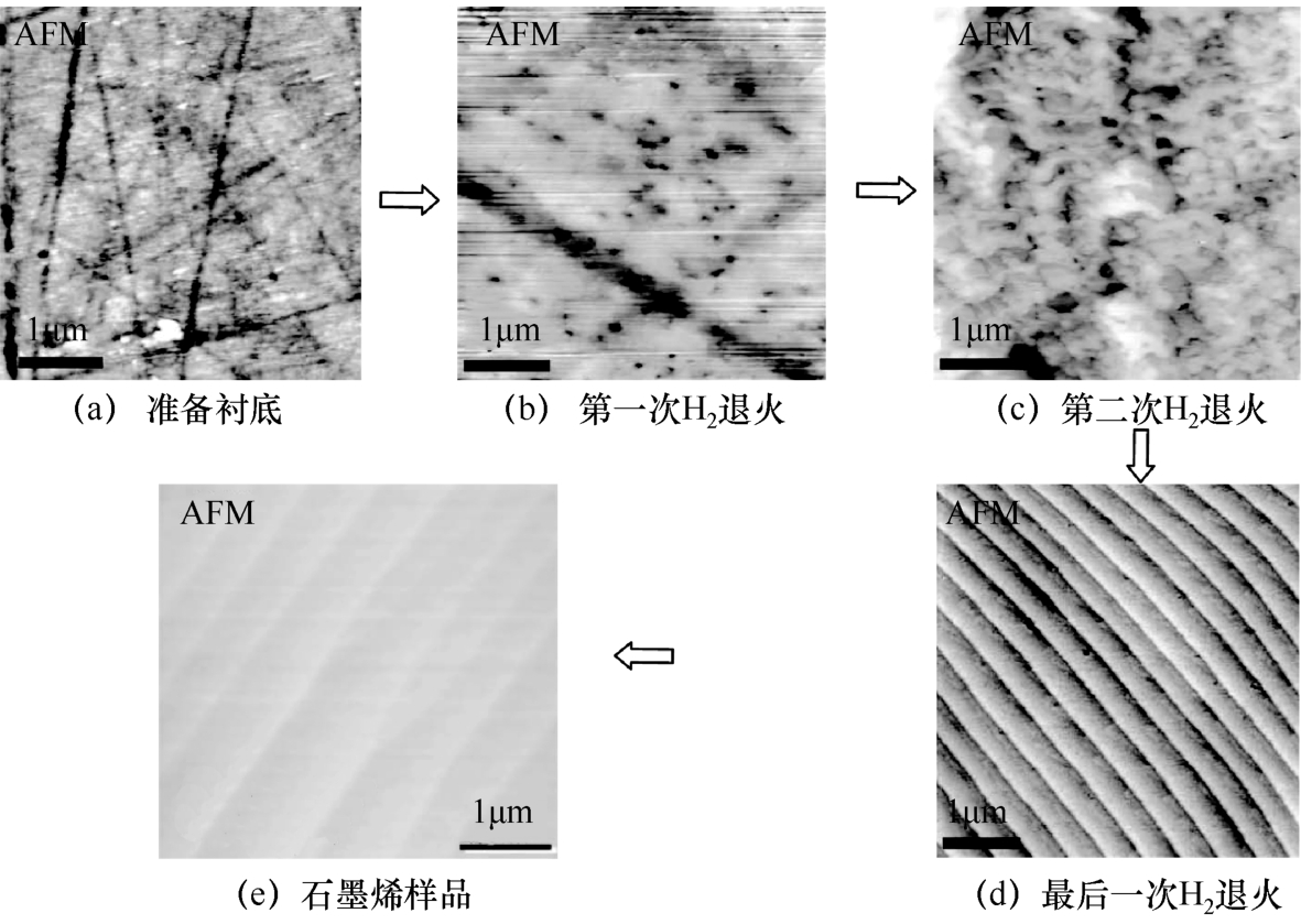 图1.6 基于碳化硅的外延生长石墨烯方法工艺流程图 [161] ,可以看到,经过表面处理的碳化硅表面达到了原子级的平坦度,制备出的石墨烯样品质量也非常好