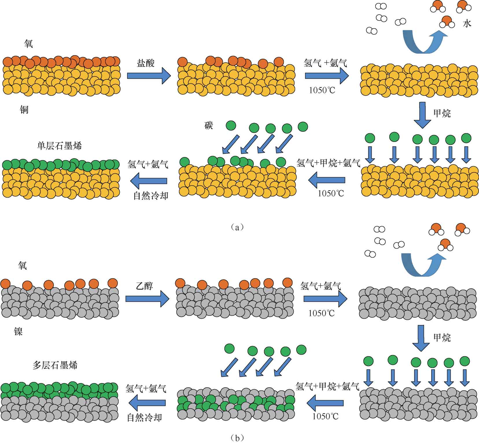 图1.7 使用(a)铜箔和(b)镍箔制备石墨烯反应过程示意图