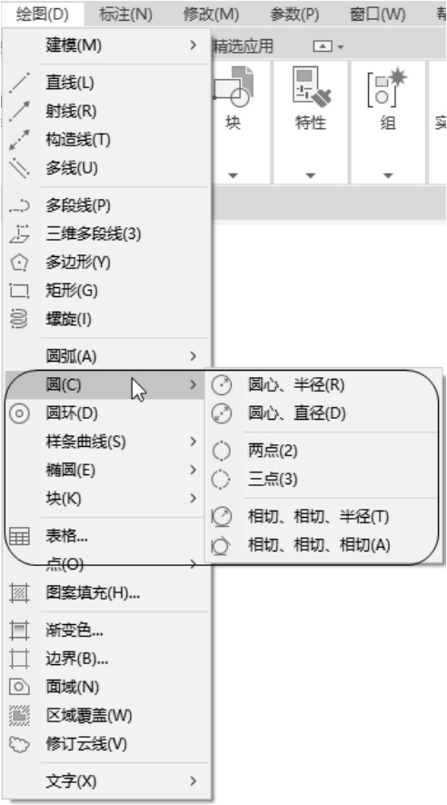 (1)带有子菜单的菜单命令。这种类型的菜单命令后面带有小三角形。例如,选择菜单栏中的“绘图”命令,指向其下拉菜单中的“圆”命令,系统就会进一步显示出“圆”子菜单中所包含的命令,如图2-2所示。
