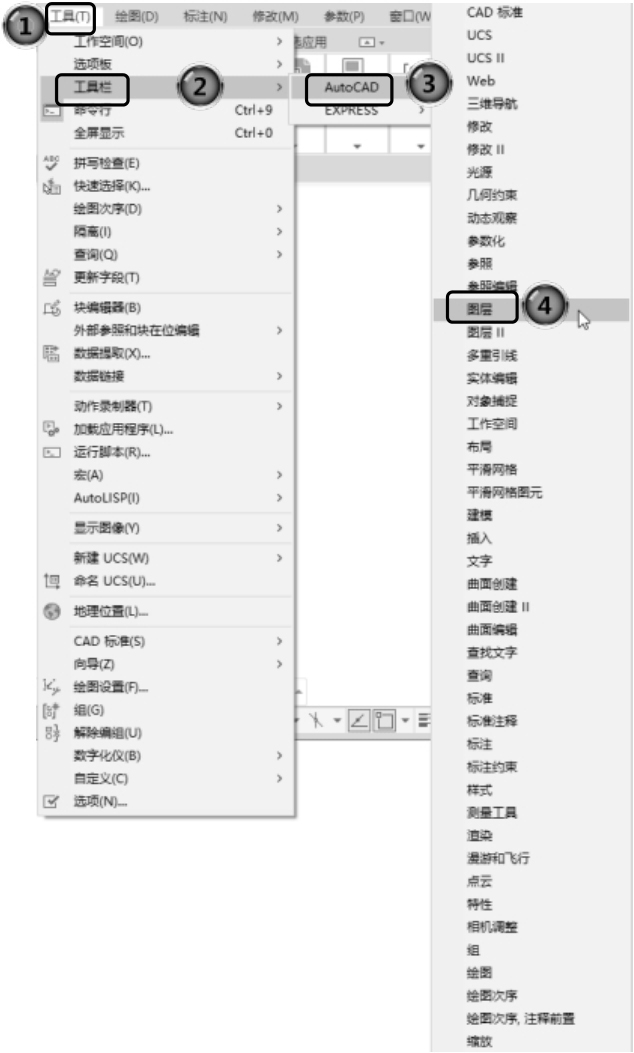 在AutoCAD标题栏的下方是菜单栏,同其他Windows程序一样,AutoCAD的菜单也是下拉形式的,并在菜单中包含子菜单。AutoCAD的菜单栏中包含13个菜单:“文件”“编辑”“视图”“插入”“格式”“工具”“绘图”“标注”“修改”“参数”“窗口”“帮助”和“Express”,这些菜单几乎包含了AutoCAD的所有绘图命令,后面的章节将对这些菜单功能做详细的讲解。一般来讲,AutoCAD下拉菜单中的命令有以下3种。