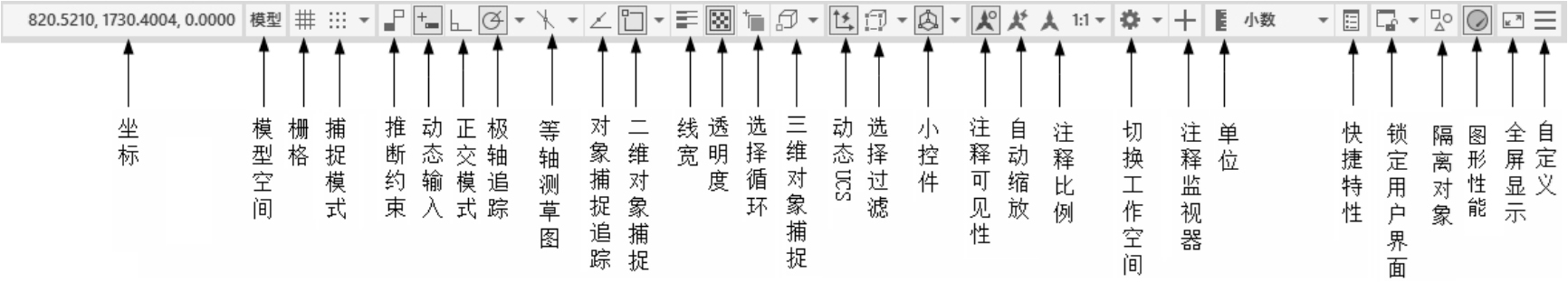 (30)自定义:状态栏可以提供重要信息,而无须中断工作流。使用MODEMACRO系统变量可将应用程序所能识别的大多数数据显示在状态栏中。使用该系统变量的计算、判断和编辑功能可以完全按照用户的要求构造状态栏。