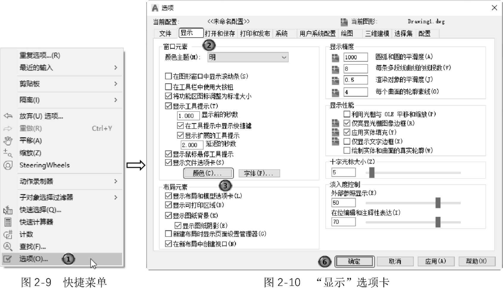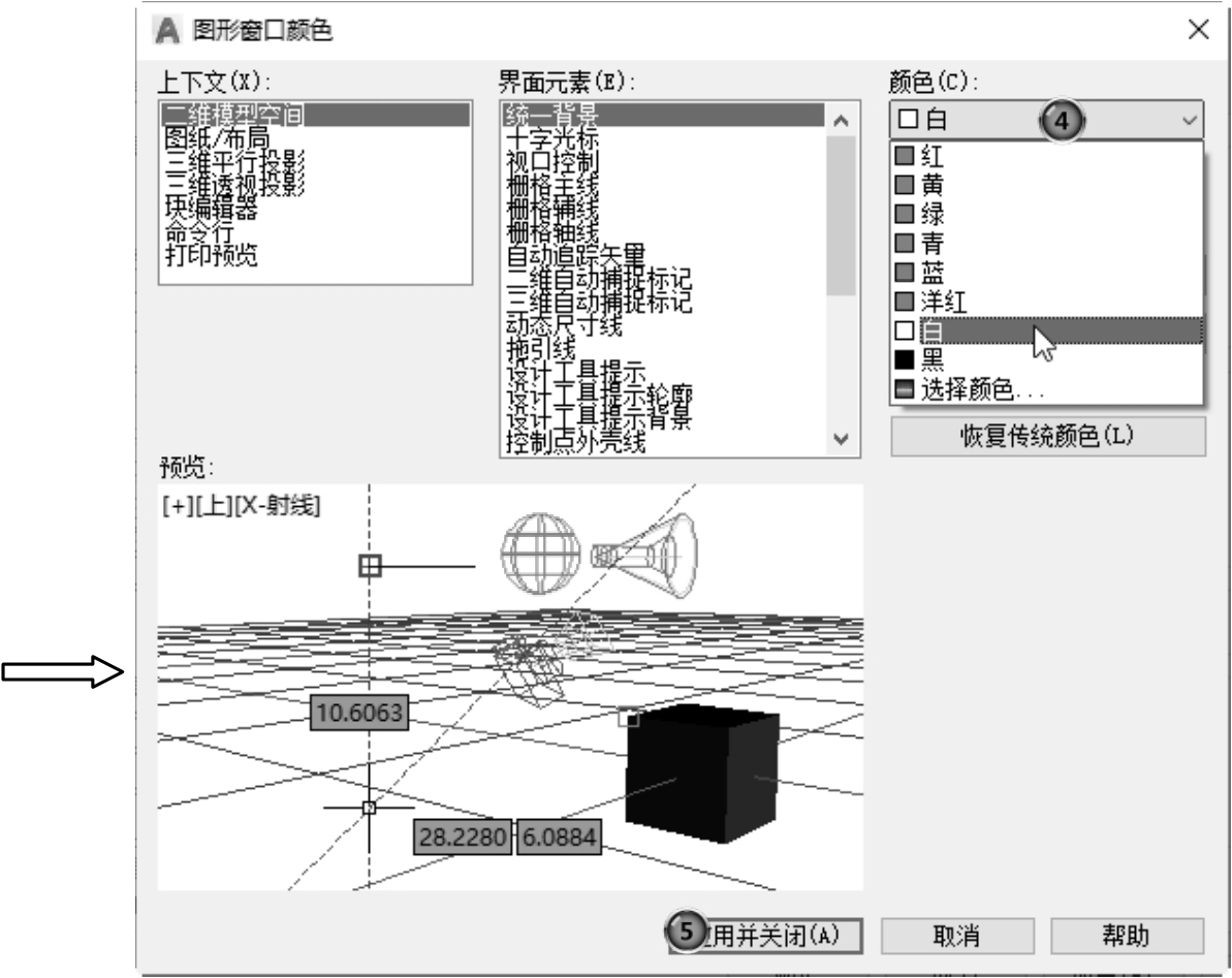 (2)修改绘图区的颜色。在默认情况下,AutoCAD的绘图区是黑色背景、白色线条,这不符合大多数用户的习惯,因此修改绘图区颜色,是大多数用户都要进行的操作。修改绘图区颜色的方法如下。