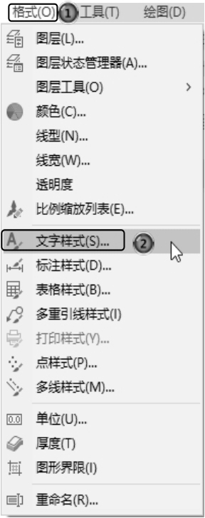 (2)打开对话框的菜单命令。这种类型的命令后面带有省略号。例如,选择菜单栏中的“格式”→“文字样式”命令,如图2-3所示,系统就会打开“文字样式”对话框,如图2-4所示。