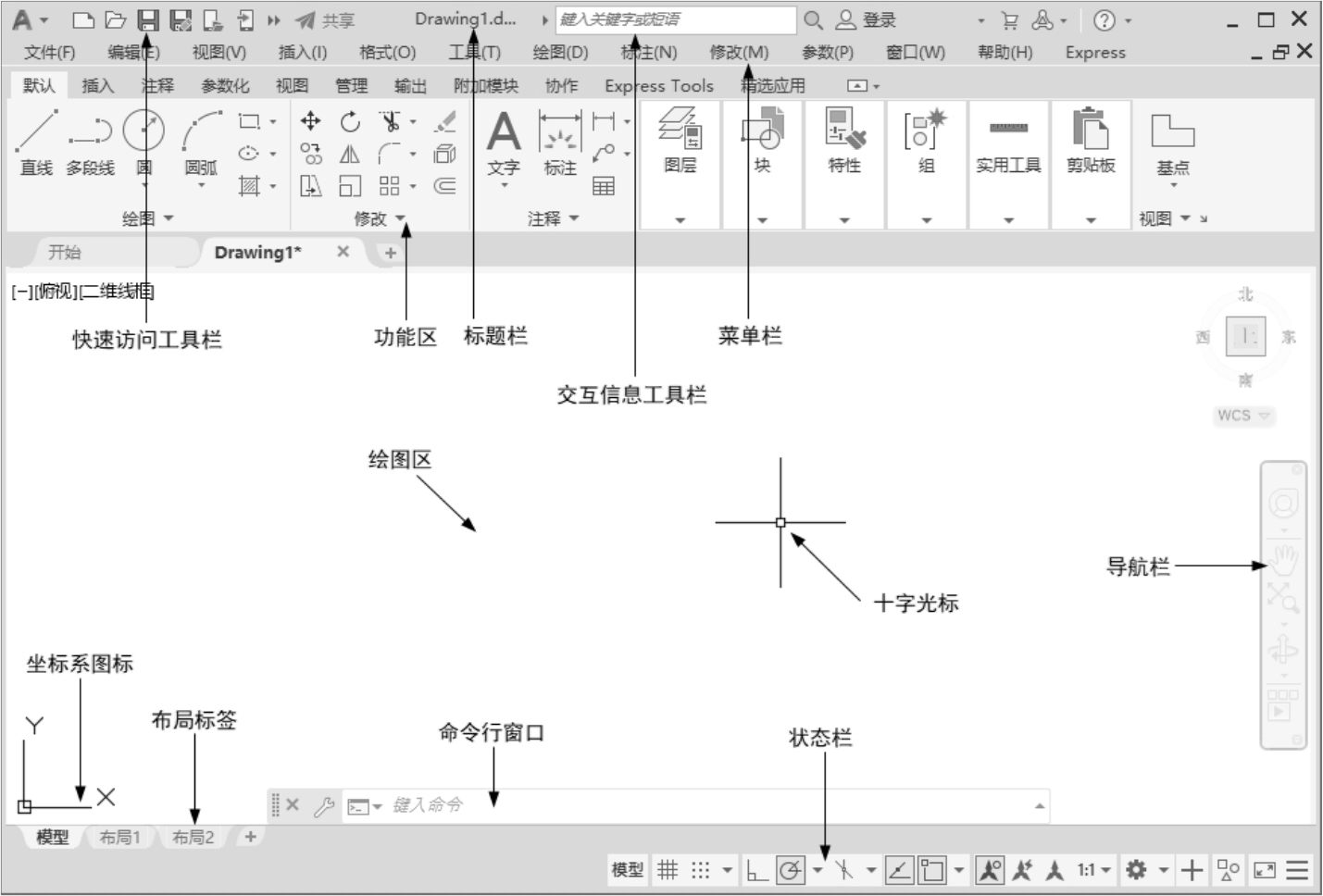 AutoCAD操作界面是AutoCAD显示、编辑图形的区域,一个完整的AutoCAD操作界面如图2-1所示,包括标题栏、菜单栏、快速访问工具栏、交互信息工具栏、功能区、绘图区、十字光标、坐标系图标、命令行窗口、状态栏、布局标签、滚动条等。
