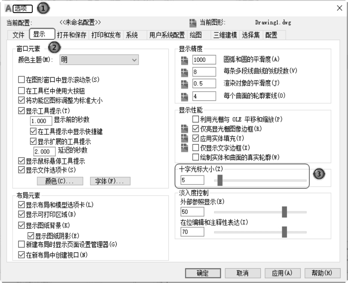 (1)修改绘图区十字光标的大小。光标的长度,用户可以根据绘图的实际需要修改其大小,修改光标大小的方法如下。