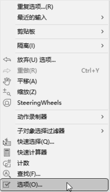 快捷菜单:在绘图区右击,系统打开快捷菜单,如图2-22所示,选择“选项”命令。