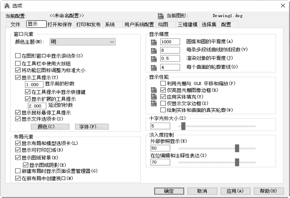 (2)显示配置。“选项”对话框中的第2个选项卡为“显示”选项卡,该选项卡用于控制AutoCAD系统的外观,如图2-24所示。该选项卡设定窗口元素、布局元素、显示精度、显示性能、十字光标大小、淡入度控制等。