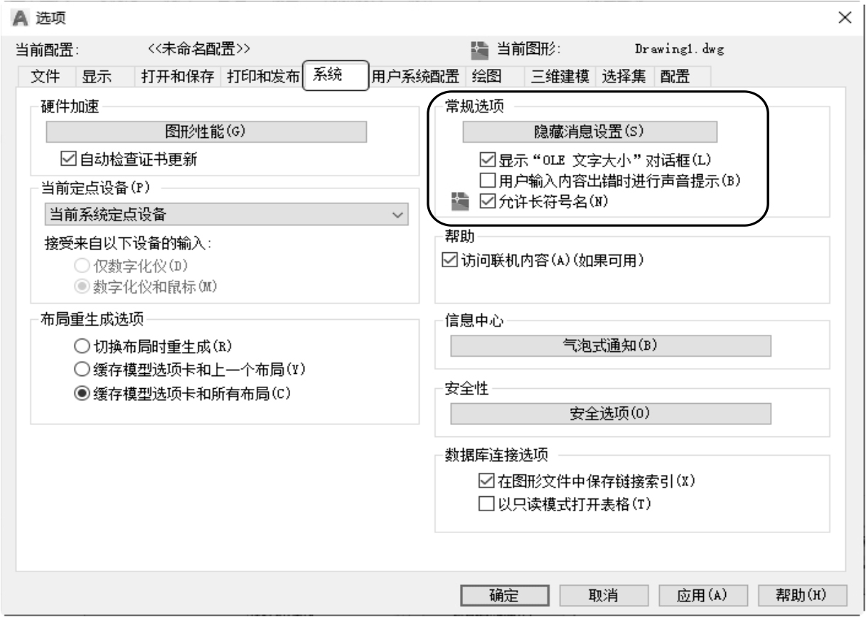 (1)系统配置。“选项”对话框中的第5个选项卡为“系统”选项卡,如图2-23所示。该选项卡用来设置AutoCAD系统的有关特性。其中“常规选项”选项组确定是否选择系统配置的有关基本选项。
