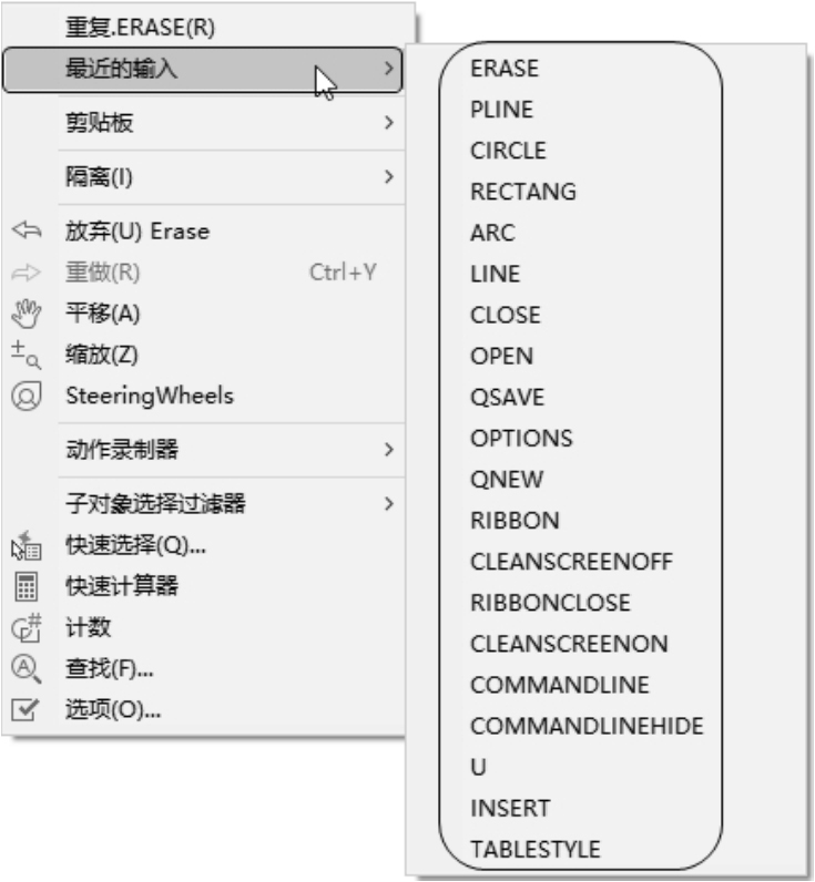 (5)在绘图区打开快捷菜单。如果在前面刚使用过要输入的命令,可以在绘图区右击,打开快捷菜单,在“最近的输入”子菜单中选择需要的命令,如图2-30所示。“最近的输入”子菜单中储存最近使用的几个命令,如果是经常使用的命令,这种方法就比较快速简洁。