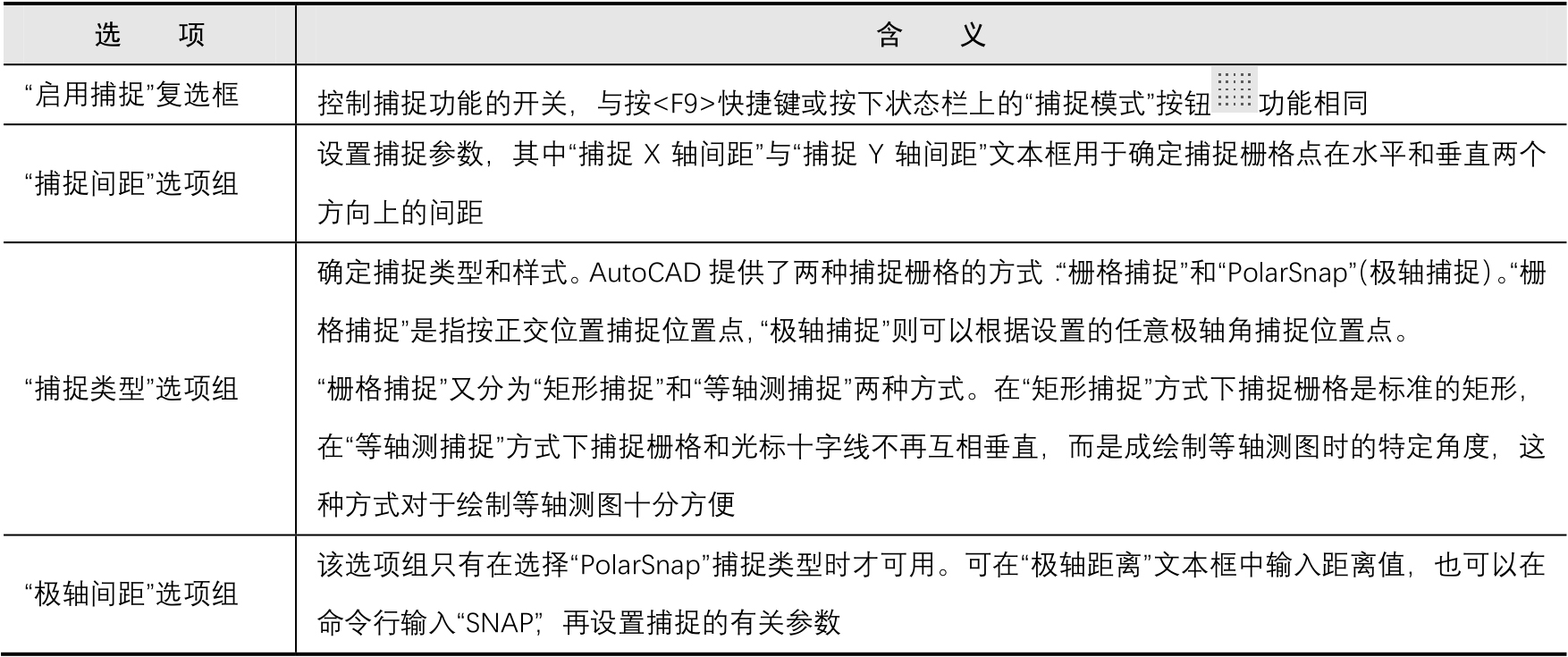 表2-3 “捕捉与栅格”选项卡选项的含义
