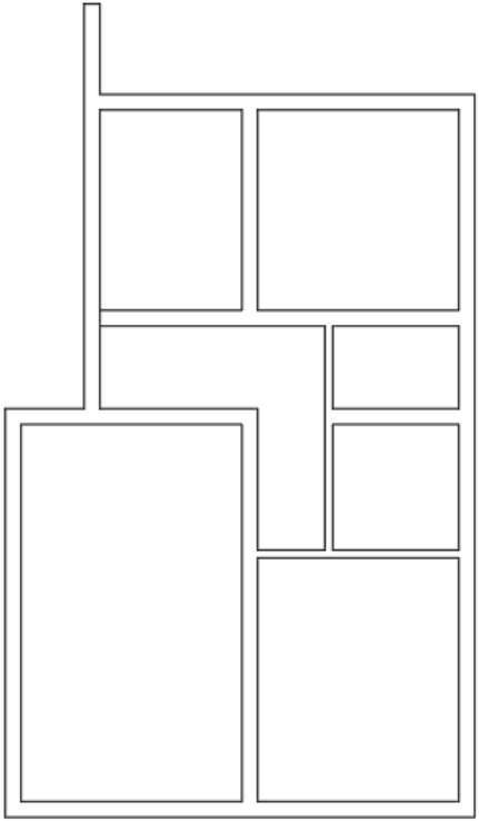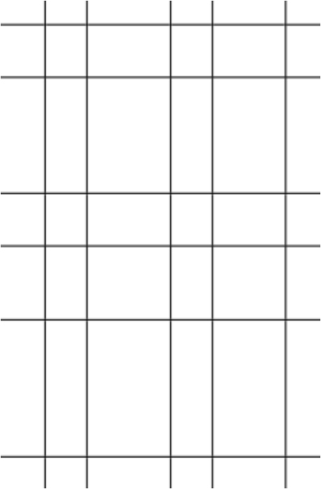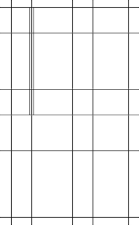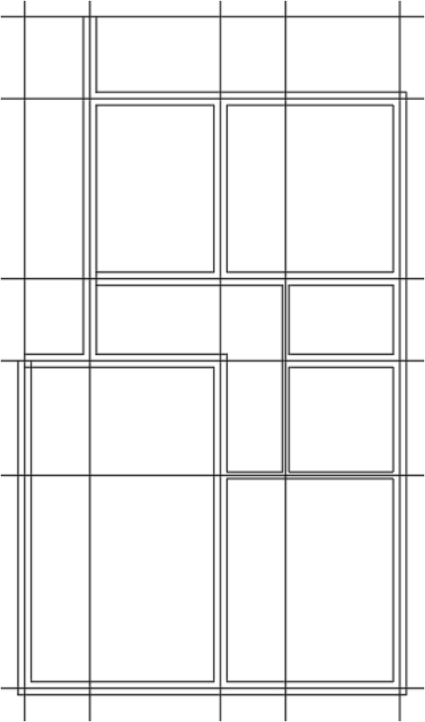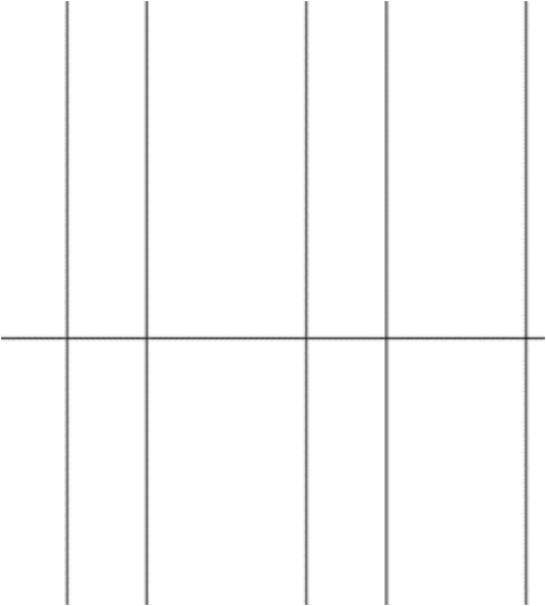 采用相同的方法将偏移得到的竖直构造线依次向右偏移2400mm、1200mm和2100mm,绘制的水平构造线如图3-68所示。采用同样的方法绘制水平构造线,依次向下偏移1500mm、3300mm、1500mm、2100mm和3900mm,绘制完成的住宅墙体辅助线网格如图3-69所示。
